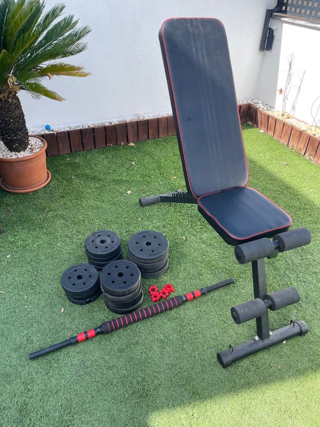 Detalles del productoBanco de pesas ajustable con barra acoplable a las mancuernas, mancuernas y discos para entrenar en casa.