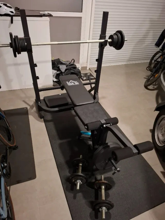 Detalles del productoBanco de pesas multifuncional, ideal para entrenar en casa. Incluye barra y discos.