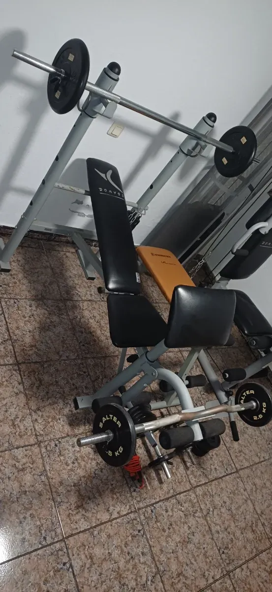 Detalles del productoBanco de pesas multifuncional con barra y discos incluidos. Ideal para entrenar en casa.