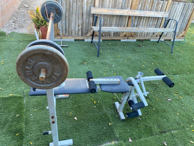 Banco de pesas para entrenamiento en casa. Incluye barra y discos. - Estructura metálica. - Discos de 10 kg. - Acolchado en el asiento y soportes. no envíos