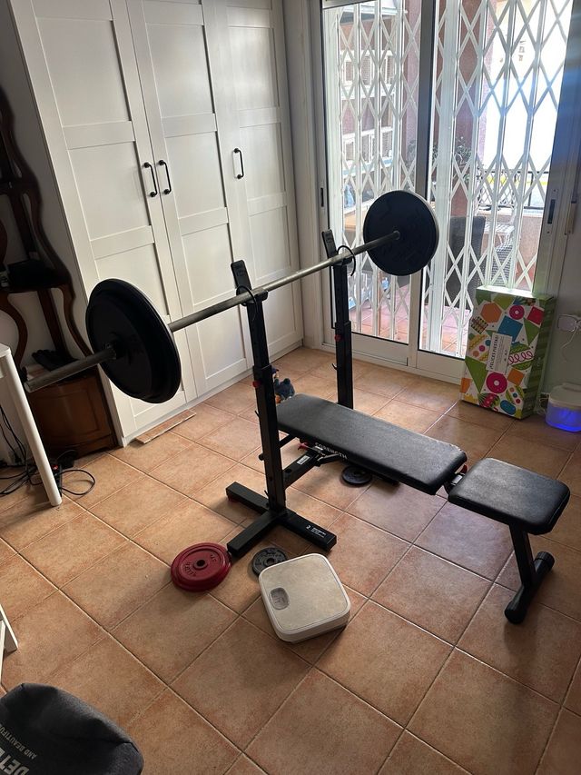 press de banca con barra y pesas. incluye la barra de 12.5 kilos, dos pesas de 10kg y dos pesas de 20kg. Tiene muy poco uso, estando prácticamente nuevo, solo tiene una pequeña rascada donde se ve en la última foto. Lo vendo por poco uso pero está muy bien la verdad.