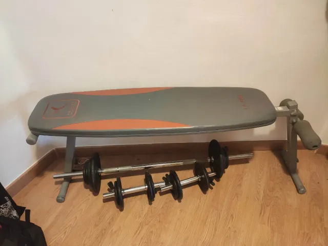 Equipo de gimnasio para entrenar en casa. - Banco de pesas con estructura gris y detalles naranjas. - Barra de pesas. - Juego de mancuernas.
