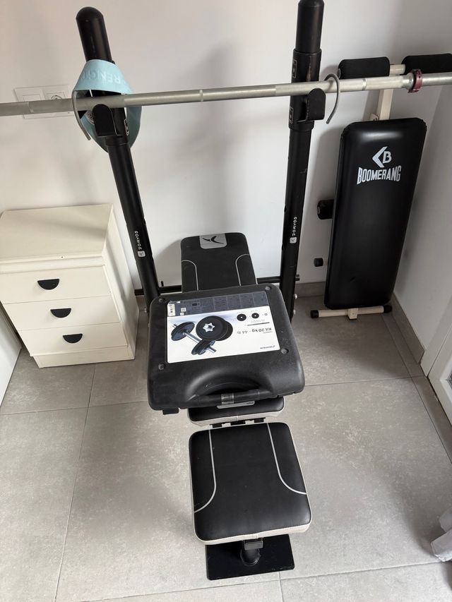 Detalles del productoBanco de pesas regulable en tres alturas con barra y caja de mancuernas de hasta 20 kg,tambien incluido banco de abdominales. Ideal para entrenar en casa.