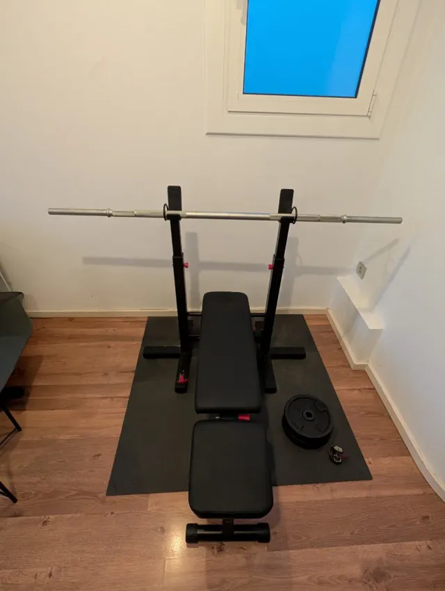 Detalles del productoBanco de musculación en color negro, ideal para entrenar en casa. Incluye barra y discos.