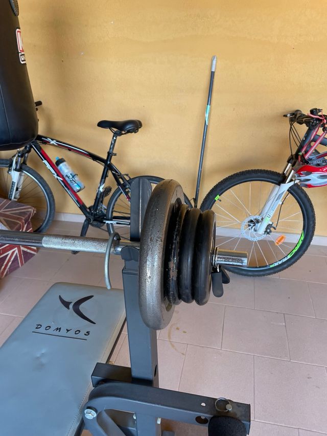 Banco de pesas para entrenamiento en casa. - Estructura metálica. - Incluye discos de pesas. El precio puede negociarse
