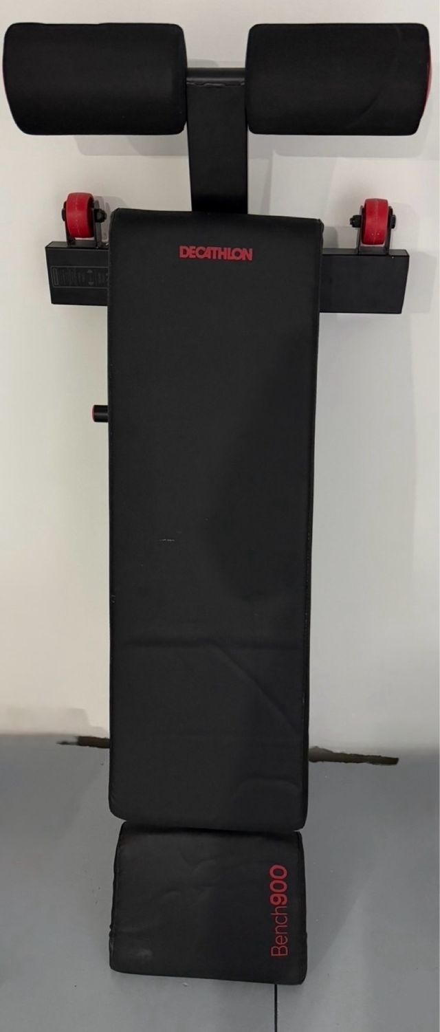 Banco de entrenamiento Decathlon modelo Bench 900. - Estructura negra. - Acolchado negro. - Ruedas rojas para transporte.