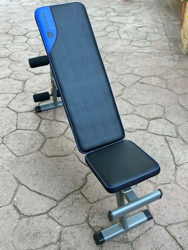 Detalles del productoBanco de pesas plegable de la marca Domyos. Ideal para entrenamientos en casa.