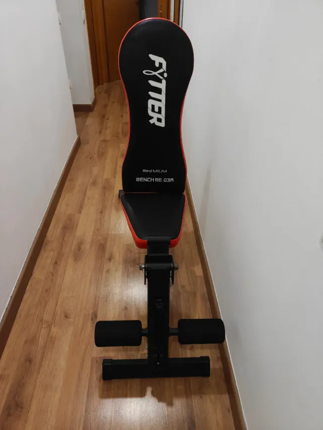 Banco de pesas FITTER modelo BE-03R. - Diseño ergonómico. - Tapicería negra con detalles en naranja. - Estructura metálica robusta.