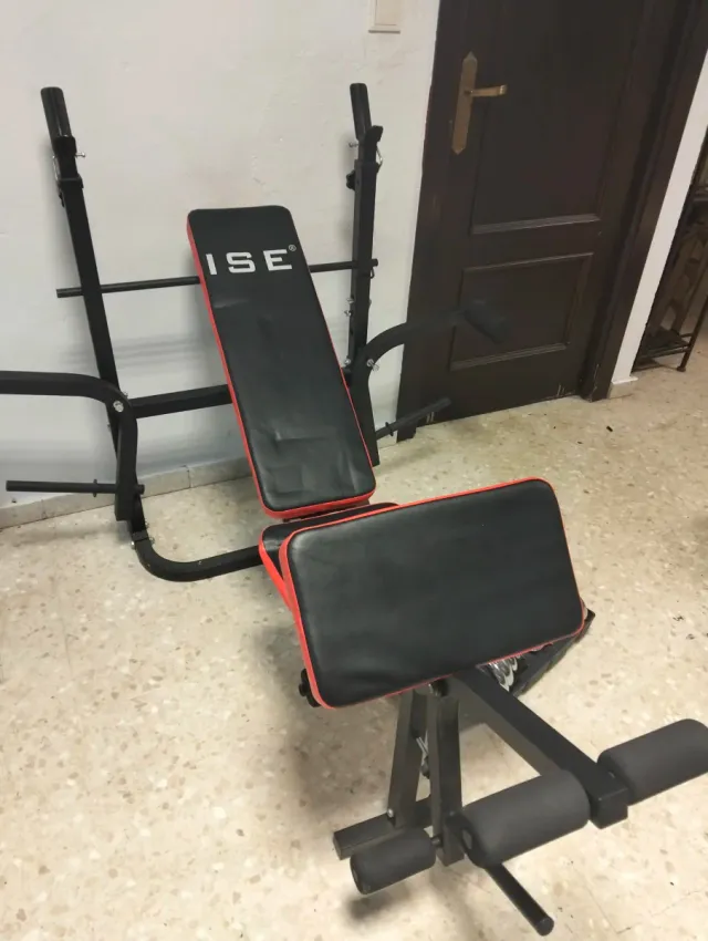 Banco de pesas ISE con estructura metálica negra y acolchado rojo y negro. - Banco ajustable. - Soporte para piernas. Juego de pesas de 20 klg
