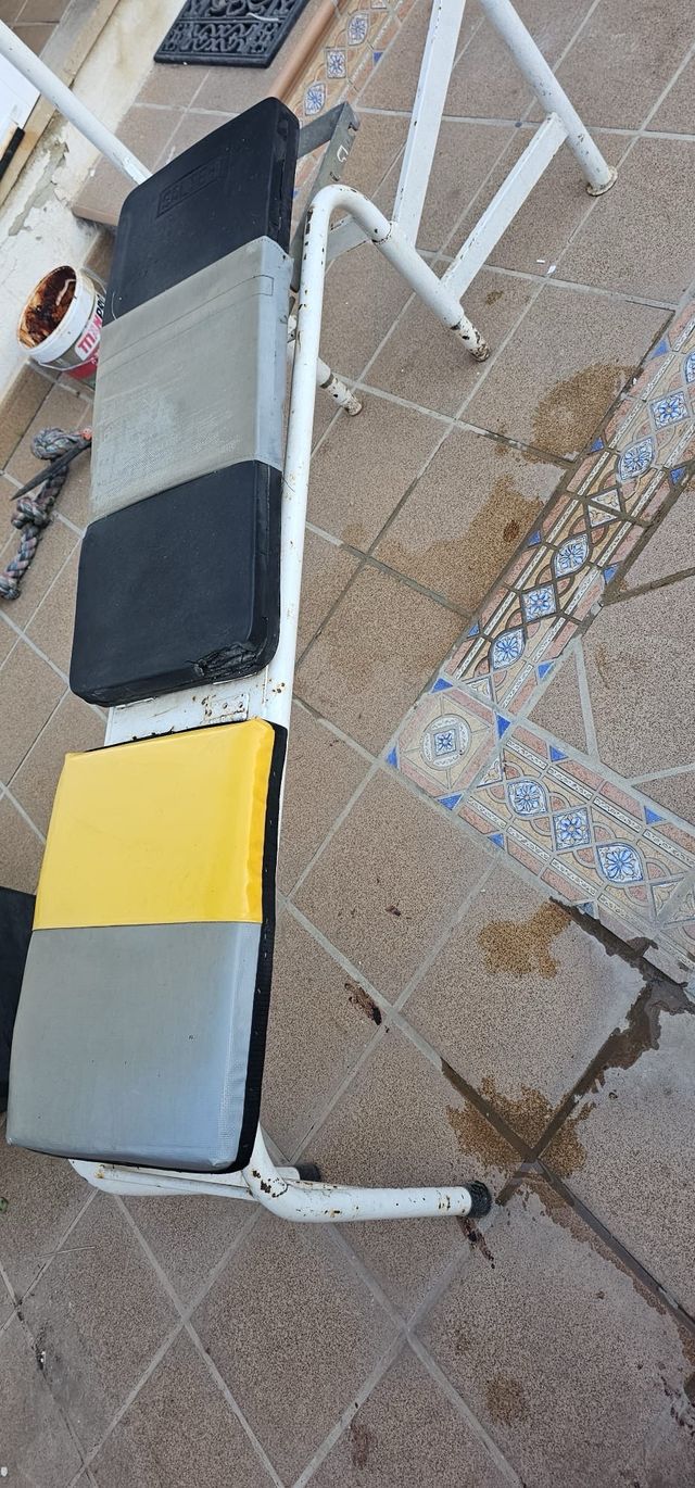 Detalles del productoBanco de pesas con estructura metálica y acolchado en varios colores.