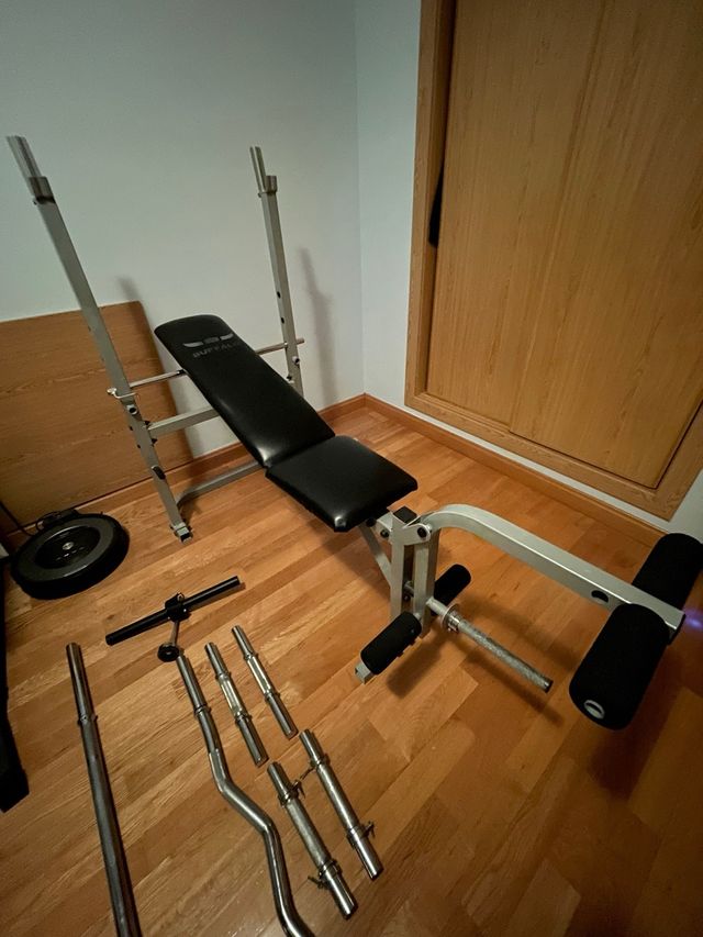 Detalles del productoBanco de pesas con soportes para barra y rodillos para ejercicios.