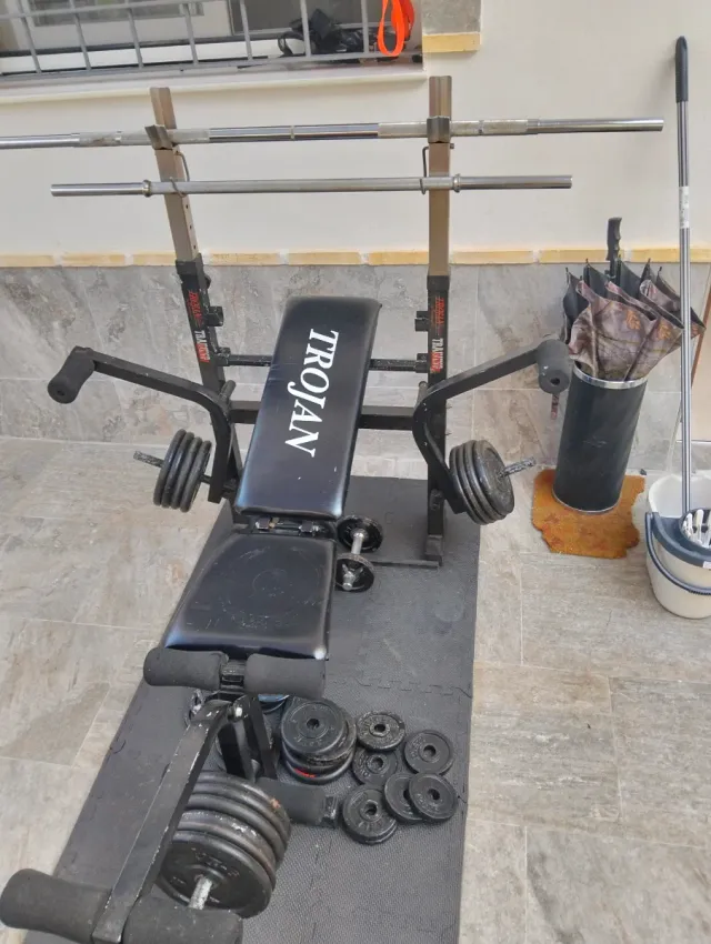 Banco de pesas multifuncional con barra y discos. - Marca: Trojan - Incluye barra grande. - Incluye discos de pesas 10 unidades de 1kg y 6 unidades de 5kg