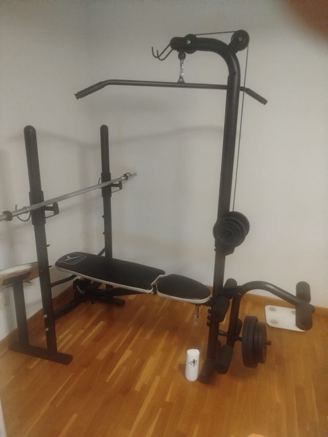 Banco de pesas multifuncional para entrenar en casa. - Estructura robusta de acero. - Asiento y respaldo acolchados. - Incluye barra y discos de pesas.