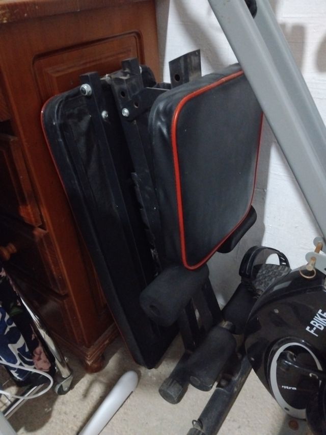 Banco de pesas plegable, ideal para entrenar en casa. - Tapicería negra con ribete rojo. - Estructura metálica resistente. - Ruedas para facilitar el transporte.