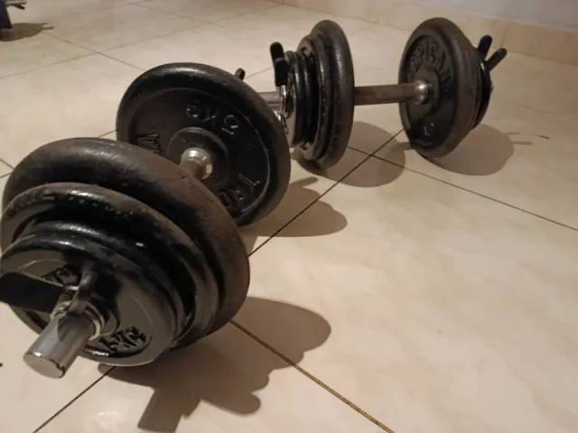 Juego de mancuernas ajustables con discos de peso. - Peso total de 40 kg. - Barras cromadas. - Discos de hierro fundido.