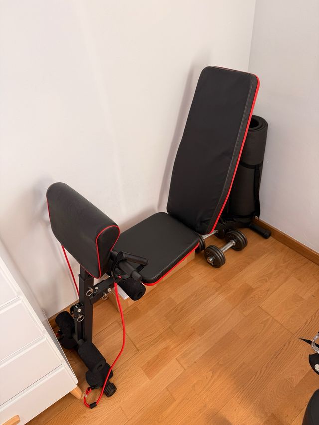 Detalles del productoBanco de pesas con diseño plegable e inclinable, ideal para entrenamientos en casa.