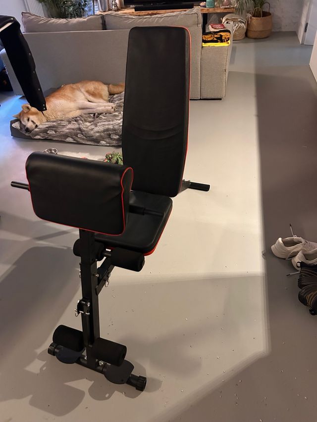 Detalles del productoBanco de pesas con estructura metálica negra y detalles en rojo. Ideal para entrenamientos en casa.