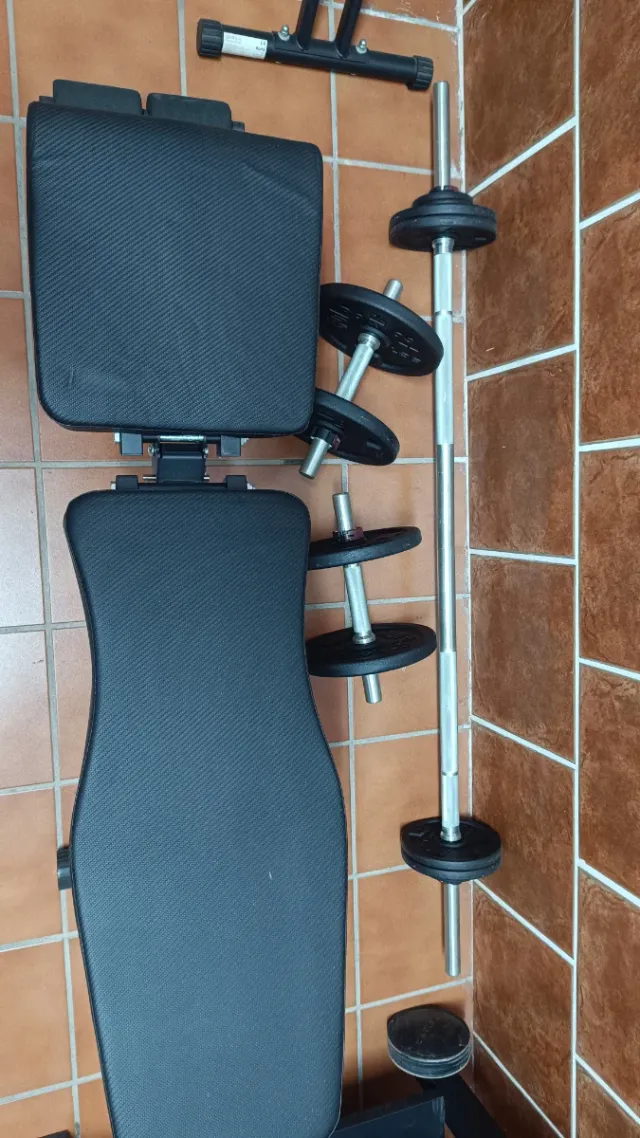 Equipo de gimnasio para entrenar en casa. - Banco de pesas con respaldo. - Barra de acero. - Discos de pesas de diferentes tamaños.
