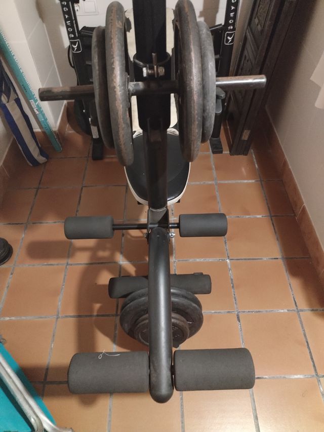 Banco de musculación con discos incluidos. Ideal para entrenar en casa. - Banco con asiento acolchado. - Barra larga y corta con discos de peso. - Soporte para ejercicios.
