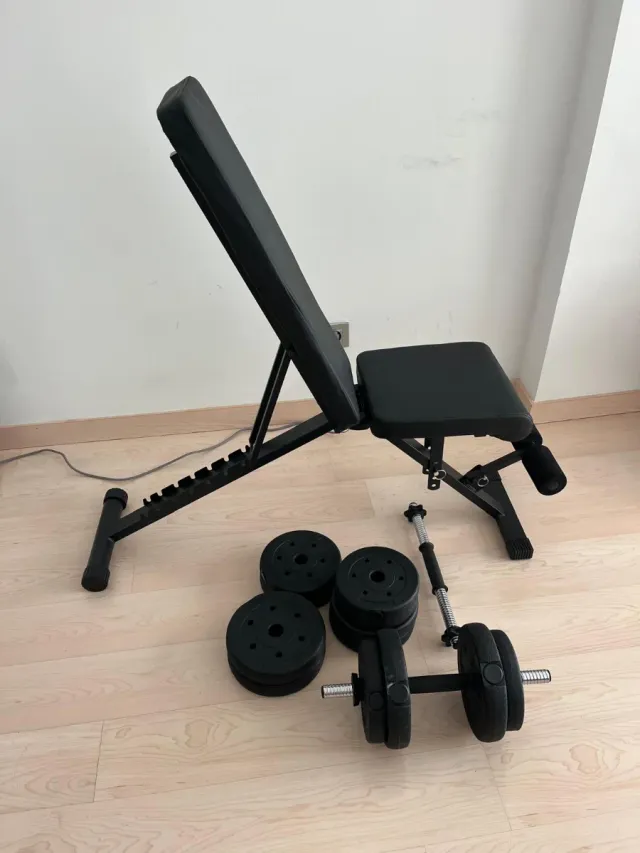 Detalles del productoEquipo de gimnasio completo para entrenar en casa. Incluye banco de pesas con respaldo ajustable y kit de discos y barras de 28mm con:
