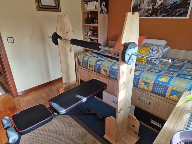 - Soporte de madera (2) para barra de pesas con doble altura para sentadillas y pecho.