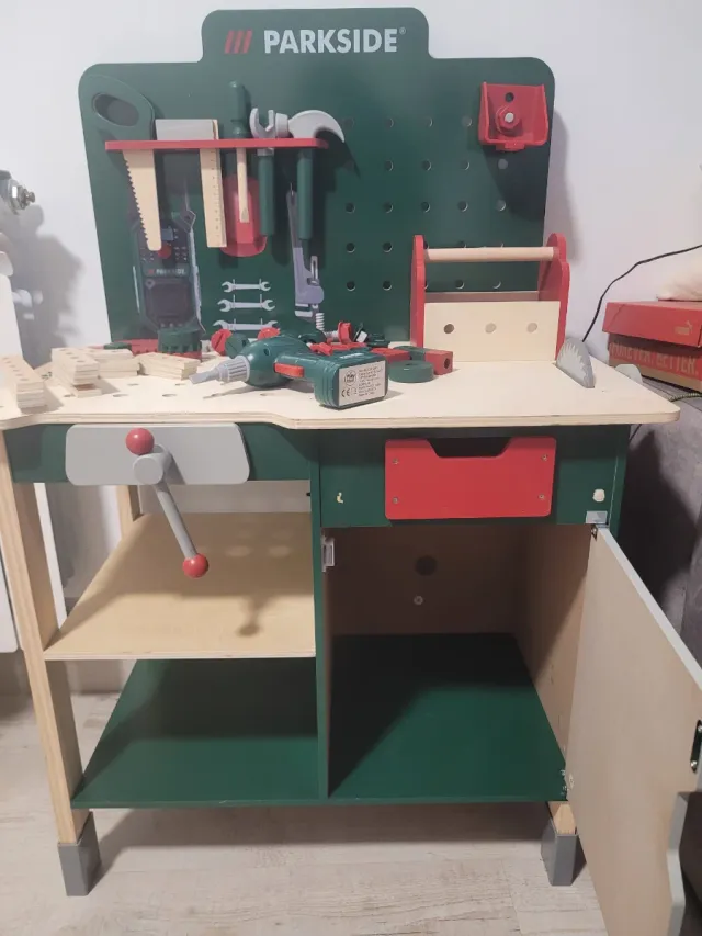 Detalles del productoBanco de trabajo infantil de madera de la marca Parkside, ideal para los pequeños manitas.