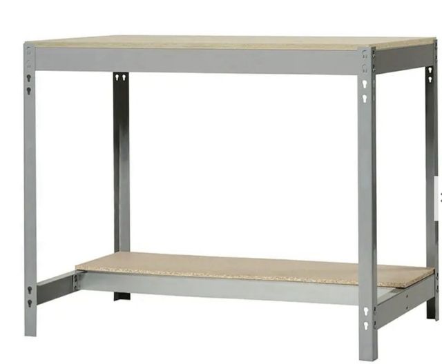 Banco de trabajo resistente con dos niveles para almacenamiento. - Estructura de metal. - Superficies de madera aglomerada.