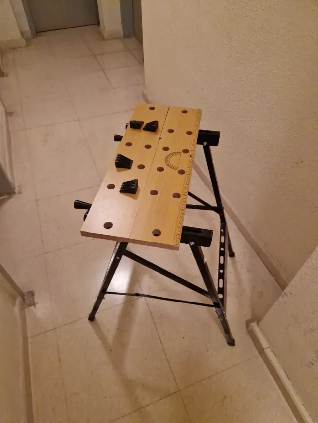 Banco de trabajo plegable, ideal para tener en casa o en el taller. - Superficie de madera. - Estructura metálica. - Plegable para fácil almacenamiento.