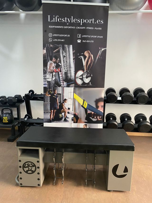 Banco funcional entrenamiento funcional con soporte para almacenamiento de mancuernas.