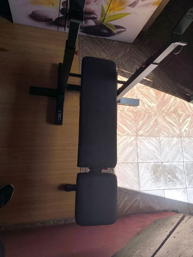 Banco de musculación con rack ultra compacto, estable y robusto. Peso máximo de 100 kg en rack con barra y 100 kg en el banco. Barra compatible de 1,55 a 2 m de longitud. Soportes ajustables.