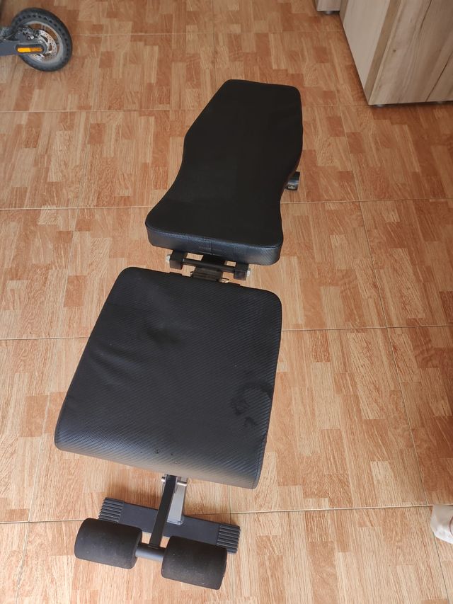 Detalles del productoBanco de pesas plegable, ideal para entrenar en casa. Está en buen estado, solo se ha usado 3 veces, viene con las pesas ajustables con 8 discos de 1kg y dos de 0,5kg. También incluye el accesorio para convertirlas en barra. Lo de la foto no es una mancha es agua de haberla limpiado.