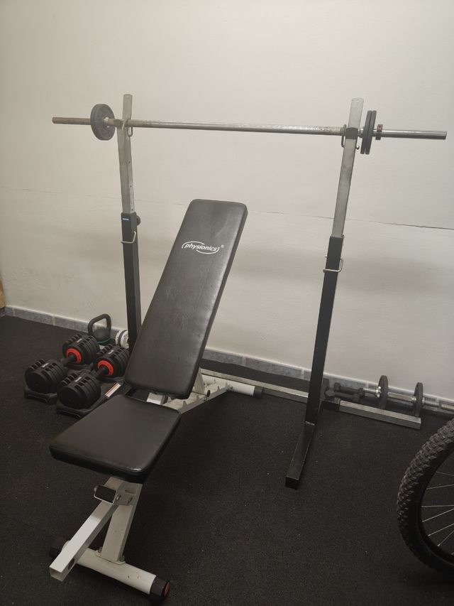 Equipo de gimnasio para entrenar en casa. - Banco ajustable. - Rack para barra. *Se vende sin barra y sin pesas.