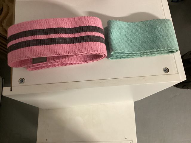 Detalles del productoConjunto de dos bandas elásticas de resistencia, una en color rosa con rayas oscuras y otra en color verde menta.