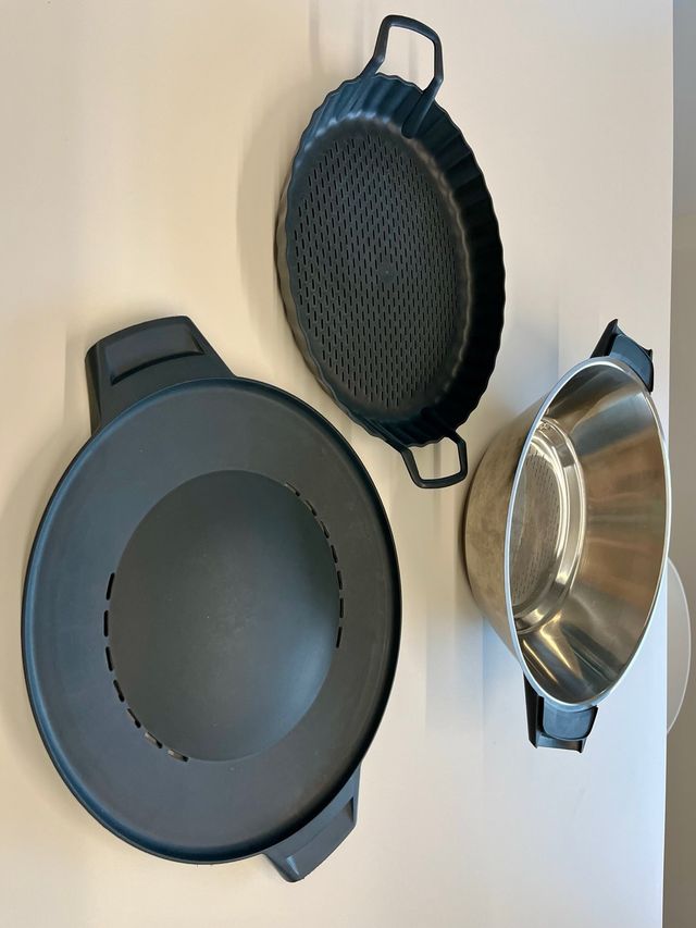Detalles del productoBandeja aroma Varoma para Thermomix TM21. fabricada en aluminio y plástico resistente a altas temperaturas fácil de limpiar ideal para cocinar, verduras, pescados, mariscos y postres al vapor. Incluye base bandeja y tapa. Se vende en excelente estado. muy poco uso. Medidas del producto