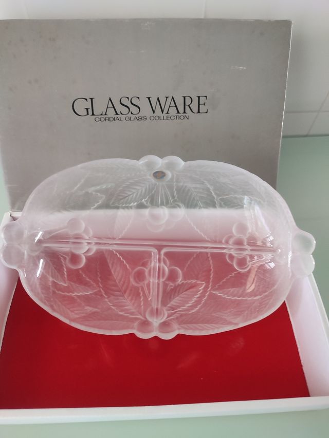 Bandeja cristal decorada con hojas y cerezas