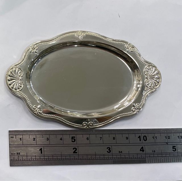 Detalles del productoElegante bandeja ovalada con un diseño clásico y detalles ornamentales en los bordes. Fabricada en plata de ley, es perfecta para servir aperitivos o como pieza decorativa.