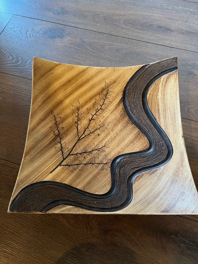 Detalles del productoBandeja decorativa con un diseño inspirado en la naturaleza, que evoca un río serpenteante y una rama de árbol.