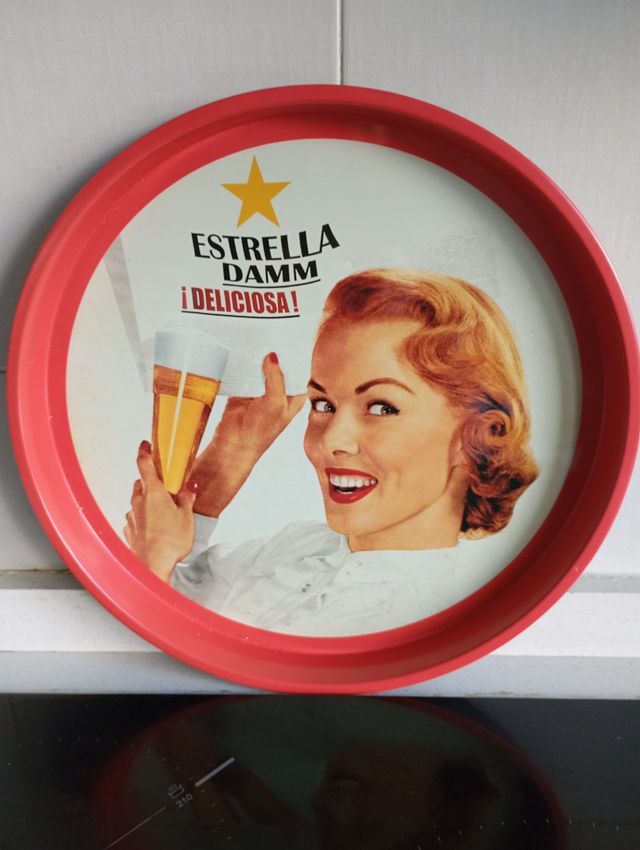Detalles del productoPreciosa bandeja metálica de Estrella Damm. Ideal para coleccionistas. - Diseño vintage con imagen de mujer. - Color rojo. - En buen estado, con señales normales de uso. Medidas del producto