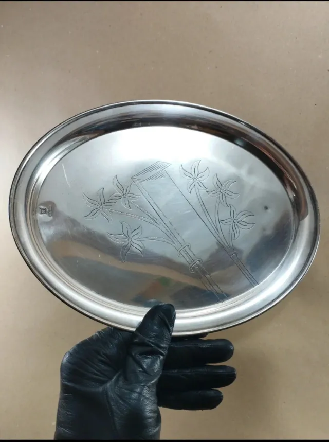 Detalles del productoPreciosa bandeja bañada en plata en estilo modernista de principios del S.XX, de la prestigiosa e historica orfebrería madrileña Meneses. Presenta ligero desgaste e irregularidades por el paso del tiempo, muy buen estado general. Mide 24cm de largo y 18cm de ancho.
