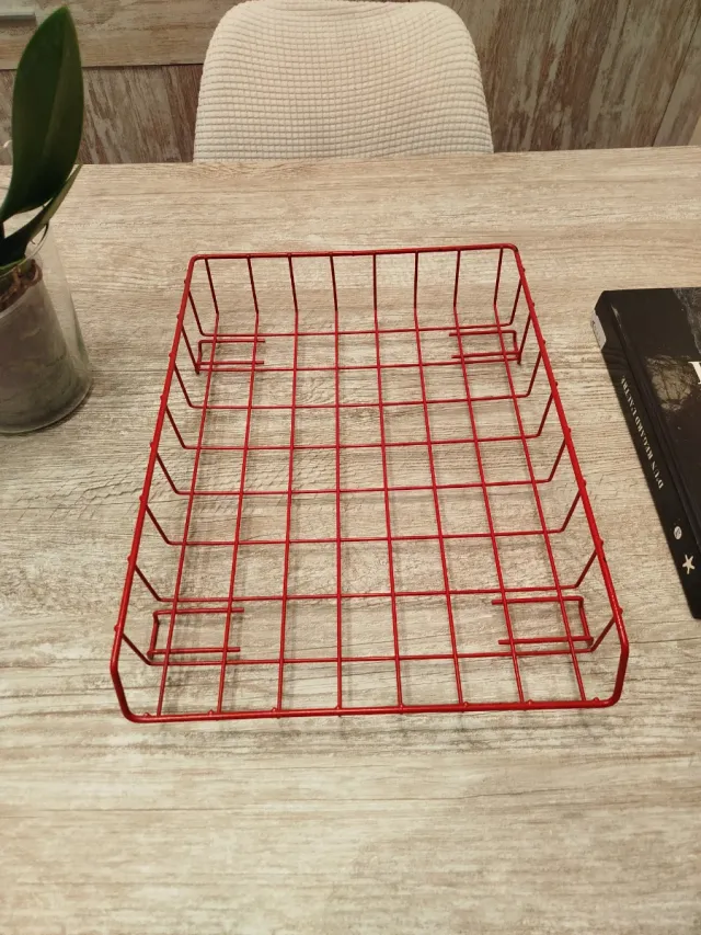Práctica bandeja de metal en color rojo. - Diseño de rejilla. - Ideal para organizar documentos o pequeños objetos.