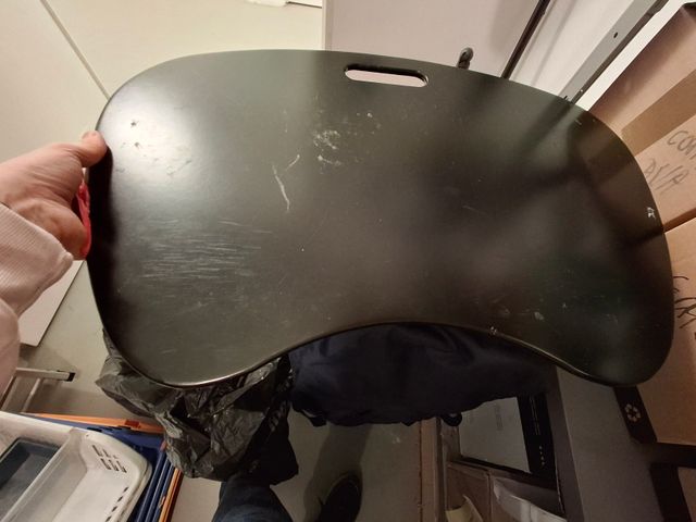 Detalles del productoMesa auxiliar portátil, ideal para usar en el sofá o cama. Es de color negro y tiene una superficie acolchada. Perfecta para comer, trabajar o leer cómodamente. Se encuentra en buen estado, aunque presenta algunas marcas de uso. Venta en persona