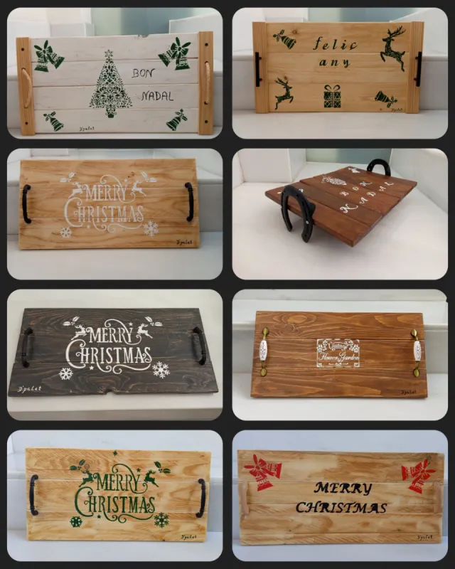 Detalles del productoConjunto de bandejas de madera hechas a mano con diseños navideños.