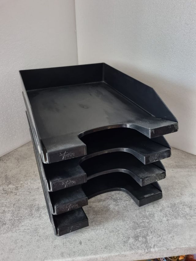 Detalles del producto🗃️🗂️📋Bandejas archivadoras de oficina de plástico negras. Es un set apilable de 4 unidades combinables.
