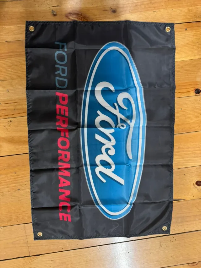 Bandera Ford Performance de tela. NUEVAS - Medidas: 60x90 cm. - Diseño en negro con detalles en rojo y azul. - Incluye ojales para colgar.