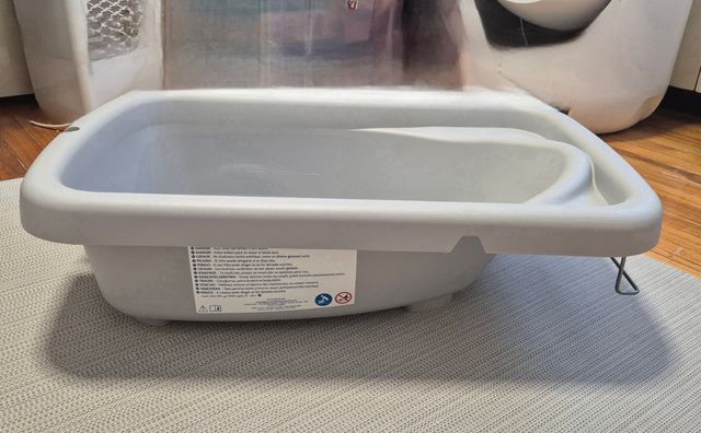 Bañera para bebé, en buen estado. Es de plástico, color gris claro, y tiene un diseño ergonómico.