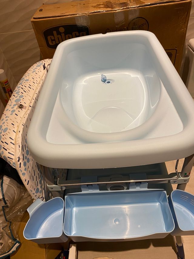 Bañera con cambiador y con desagüe también lleva ruedas para poder transportar