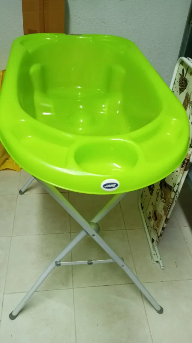 Detalles del productoBañera para bebé de la marca Jane, en color verde brillante. Incluye un soporte plegable para mayor comodidad.