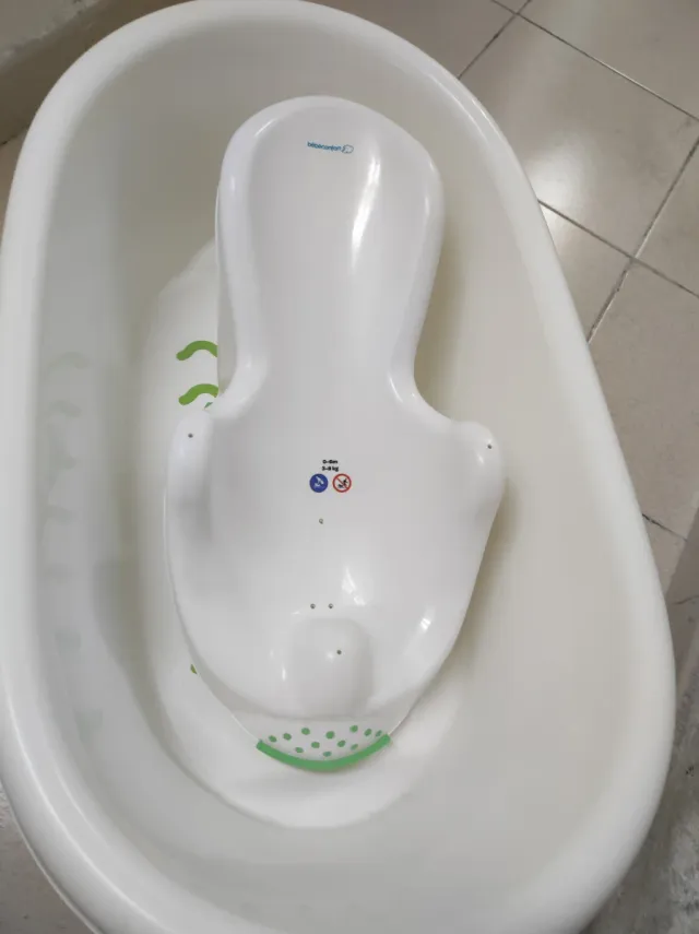 Bañera para bebé con soporte. - Color blanco. - Soporte ergonómico para recién nacidos. - Indicaciones de edad y peso en el soporte.