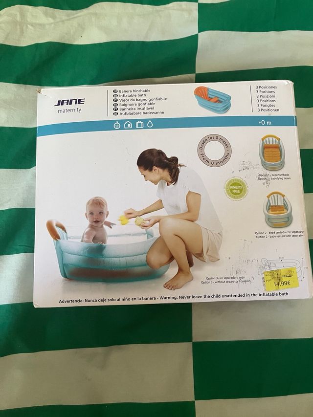 Detalles del productoBañera inflable Jané para bebé, en perfecto estado. Es hinchable y tiene 3 posiciones. Incluye la bañera y un separador para el bebé. Ideal para bañar a tu pequeño de forma cómoda y segura.