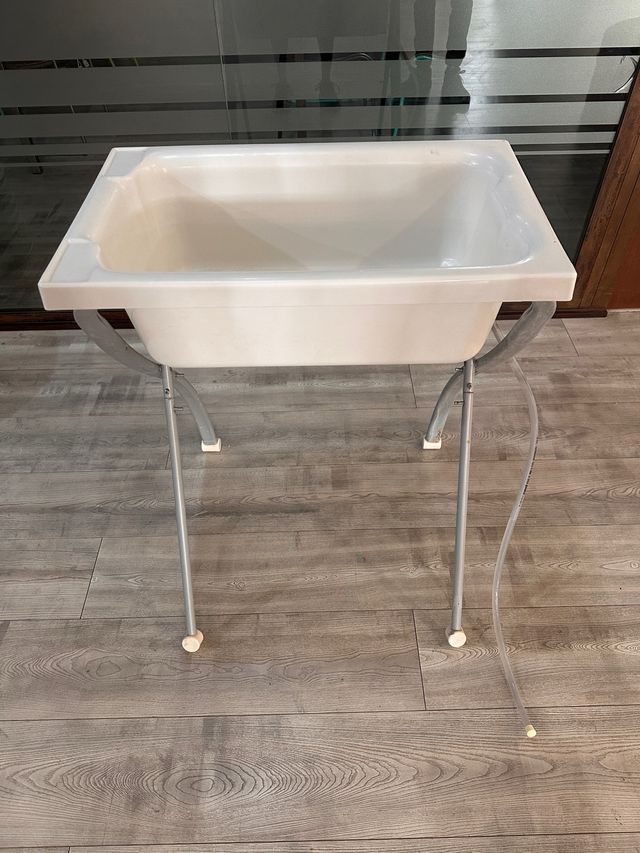 Bañera para bebés con patas metálicas. - Color blanco. - Estructura de metal. - Incluye tubo de desagüe.
